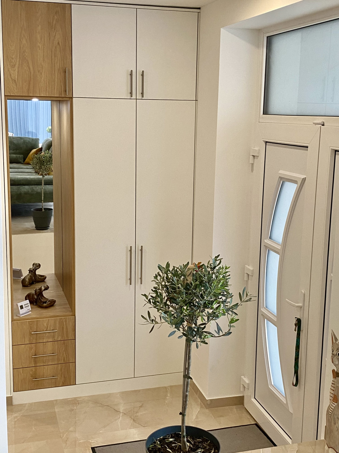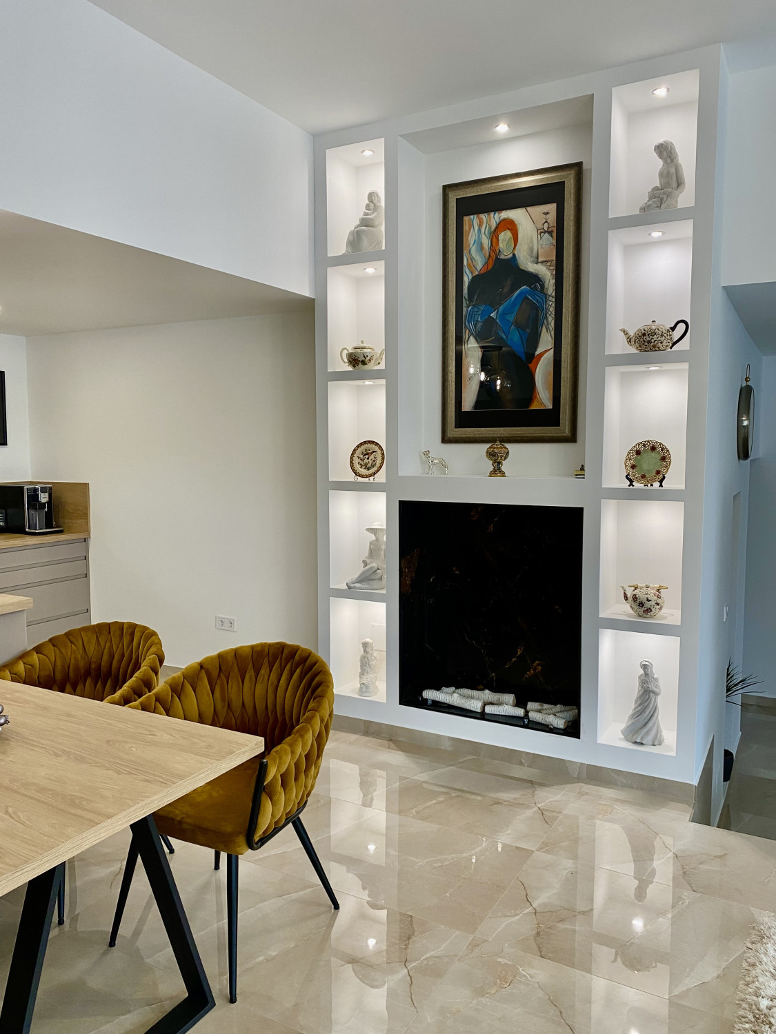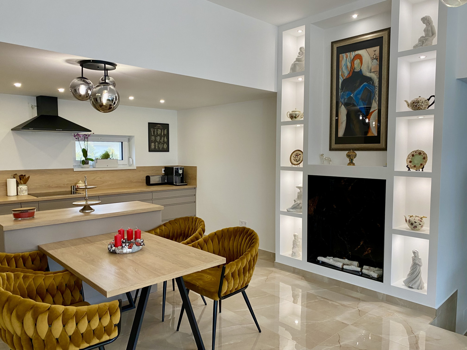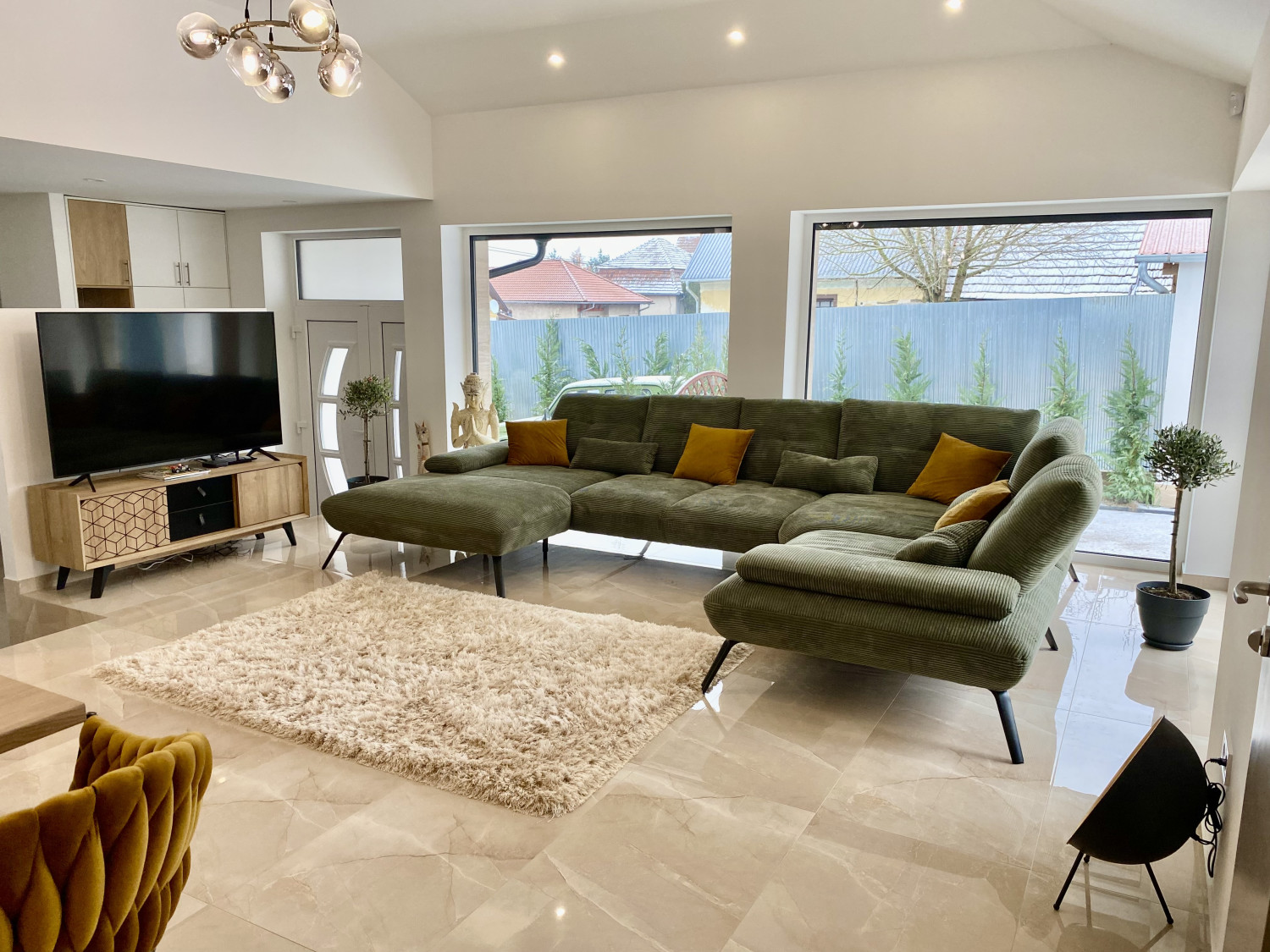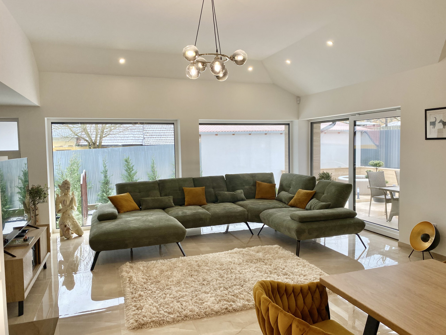 A régi házban szinte csak a külső falak maradtak, a teljes belső tér átalakításra, átszervezésre került, hogy alkalmas legyen egy 2 gyermekes család számára. A két nagy helységből 3 hálószoba, dolgozószoba és fürdőszoba került kialakításra, a további terek pedig egybe lettek nyitva, hogy egy közel 50 nm-es kényelmes, modern, amerikai konyhás nappali legyen a ház középpontjában. A ház hátsó részében háztartási helység, mosókonyha és vendég wc kapott helyet, valamint egy két beállásos garázs. A tulajdonosok modern berendezést szerettek volna, de a műtárgy gyűjteményüket is szerették volna kiállítani, ez az általam tervezett kandalló körül kapott helyet a beépített polcokon. A folyosókon és az előtérben beépített szekrények kaptak helyet, a mosókonyhában pedig egy egyedi tolóajtós szekrény, mely a mosó és szárítógépet rejti. A berendezés modern, letisztult, a tulajdonosok mindenképpen nagy méretű kanapét, konyhaszigetet és bővíthető étkezőasztalt szerettek volna. Az így kialakított belső tér tökéletesen alkalmas és kényelmesen lakható lett egy család számára.