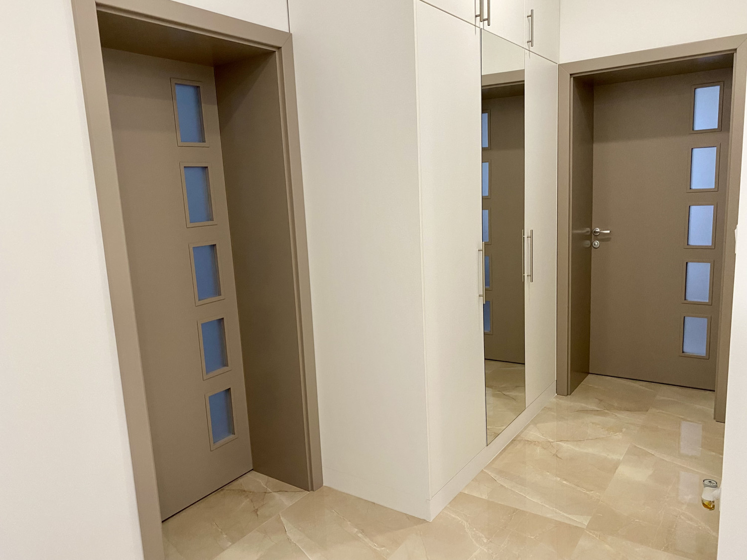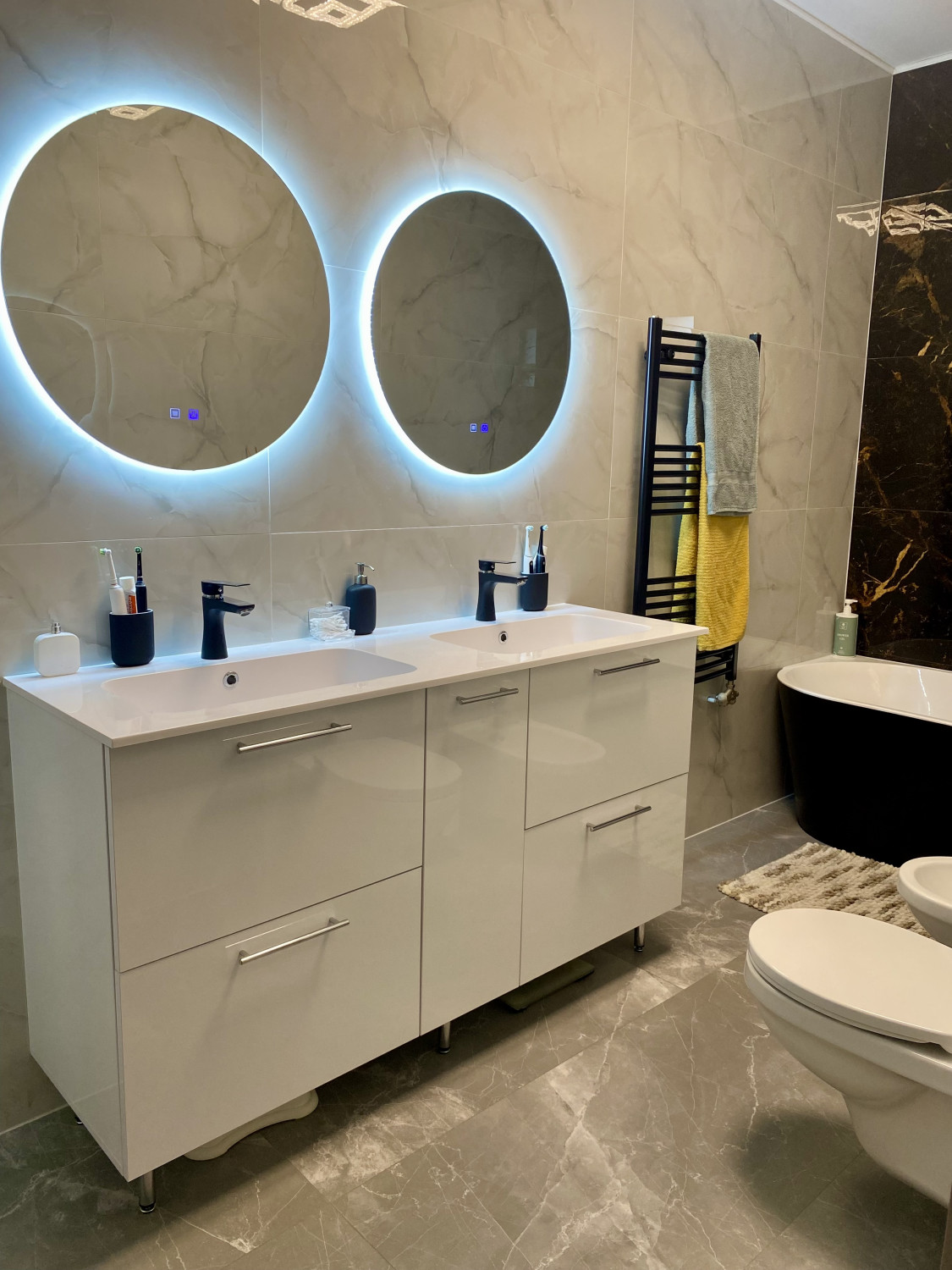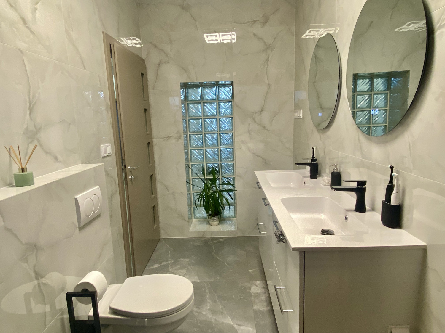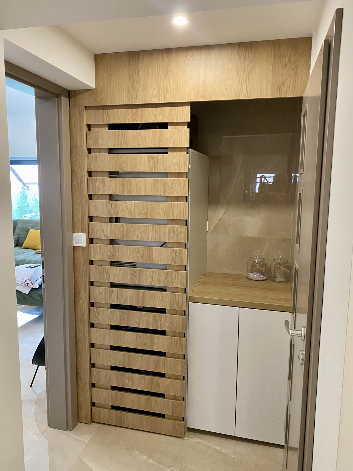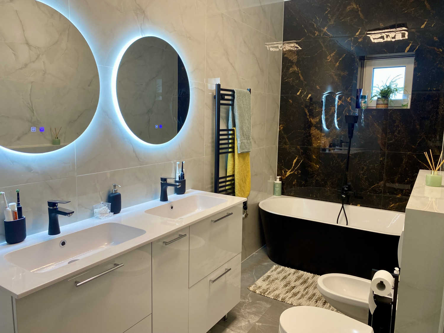 A régi házban szinte csak a külső falak maradtak, a teljes belső tér átalakításra, átszervezésre került, hogy alkalmas legyen egy 2 gyermekes család számára. A két nagy helységből 3 hálószoba, dolgozószoba és fürdőszoba került kialakításra, a további terek pedig egybe lettek nyitva, hogy egy közel 50 nm-es kényelmes, modern, amerikai konyhás nappali legyen a ház középpontjában. A ház hátsó részében háztartási helység, mosókonyha és vendég wc kapott helyet, valamint egy két beállásos garázs. A tulajdonosok modern berendezést szerettek volna, de a műtárgy gyűjteményüket is szerették volna kiállítani, ez az általam tervezett kandalló körül kapott helyet a beépített polcokon. A folyosókon és az előtérben beépített szekrények kaptak helyet, a mosókonyhában pedig egy egyedi tolóajtós szekrény, mely a mosó és szárítógépet rejti. A berendezés modern, letisztult, a tulajdonosok mindenképpen nagy méretű kanapét, konyhaszigetet és bővíthető étkezőasztalt szerettek volna. Az így kialakított belső tér tökéletesen alkalmas és kényelmesen lakható lett egy család számára.